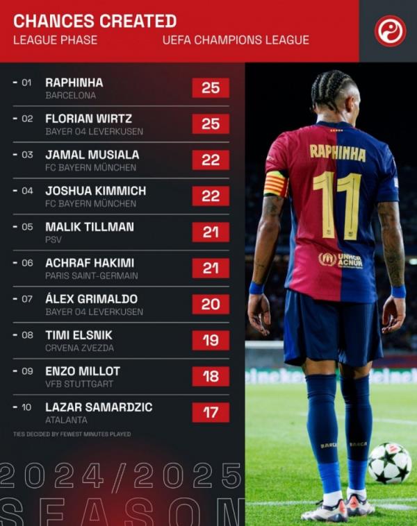 1月30日讯 欧冠联赛阶段已经全部结束。Squawka统计了联赛阶段球员创造机会次数的排行榜,其中,拉菲尼亚和维尔茨创造25次机会,排在榜首。