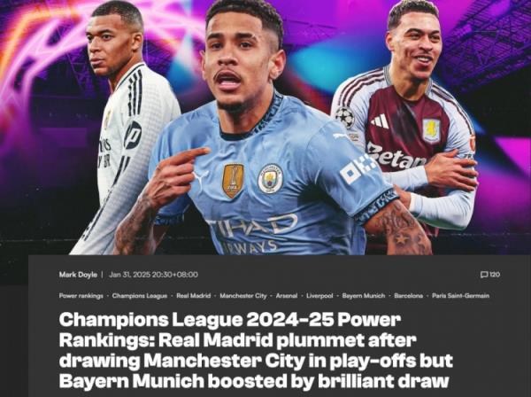 2月1日讯 欧冠淘汰赛附加赛抽签结果落定,皇马与曼城狭路相逢。“进球网”根据抽签结果评出了欧冠24队最新的战力排名。