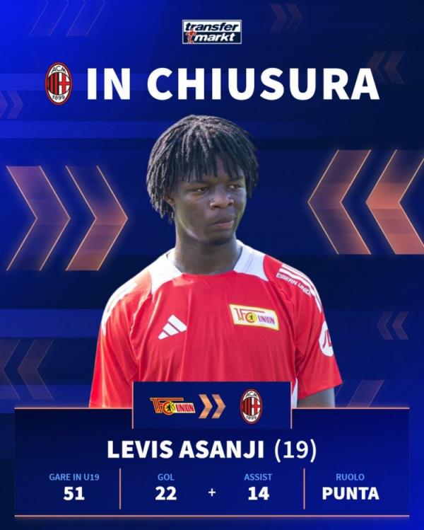现年19岁的阿桑吉目前在柏林联合U19效力,一共出场51次贡献22球14助攻,本赛季出场14次打进10球,预计他将在周一接受加盟米兰的体检。