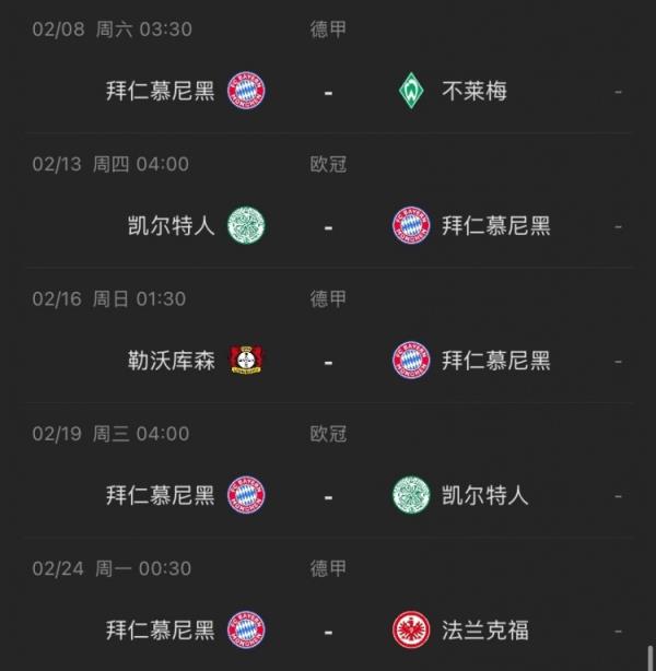 拜仁2月赛程↓