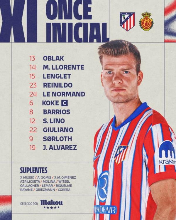 替补:穆索、戈米斯、吉梅内斯、阿斯皮利奎塔、莫利纳、维特塞尔、加拉格尔、勒马尔、里克尔梅、贝莱德、格列兹曼、科雷亚