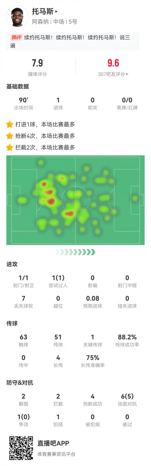 2月3日讯 阿森纳在本轮英超5-1大胜曼城,托马斯本场数据如下: