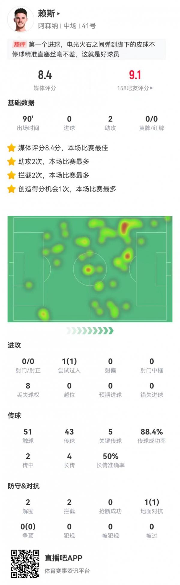 2月3日讯 阿森纳在本轮英超焦点战5-1大胜曼城,赖斯本场数据如下:
