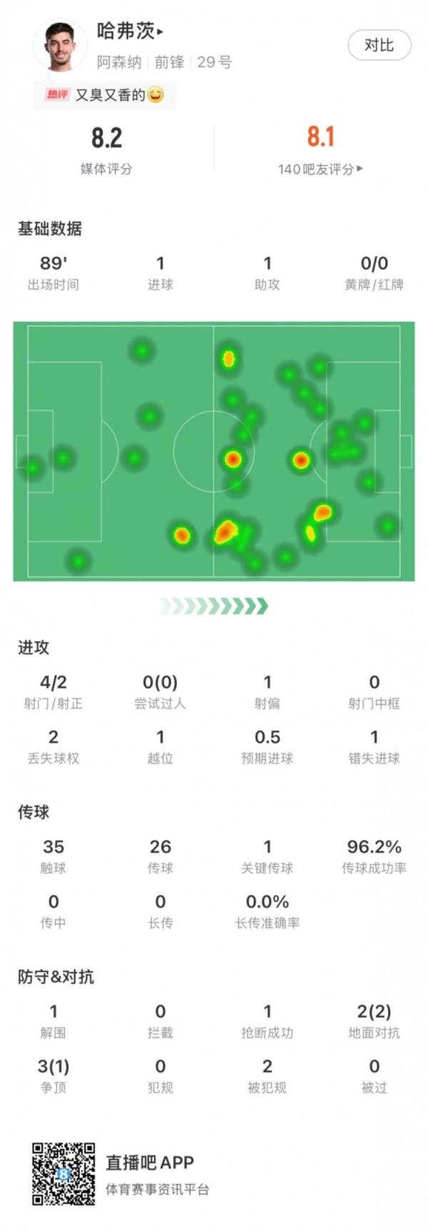 哈弗茨全场数据如下: