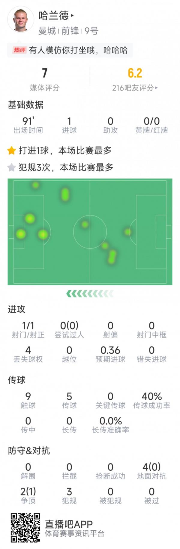 2月3日讯 在本轮英超,曼城1-5不敌阿森纳,哈兰德打进一球,以下为他在本场数据: