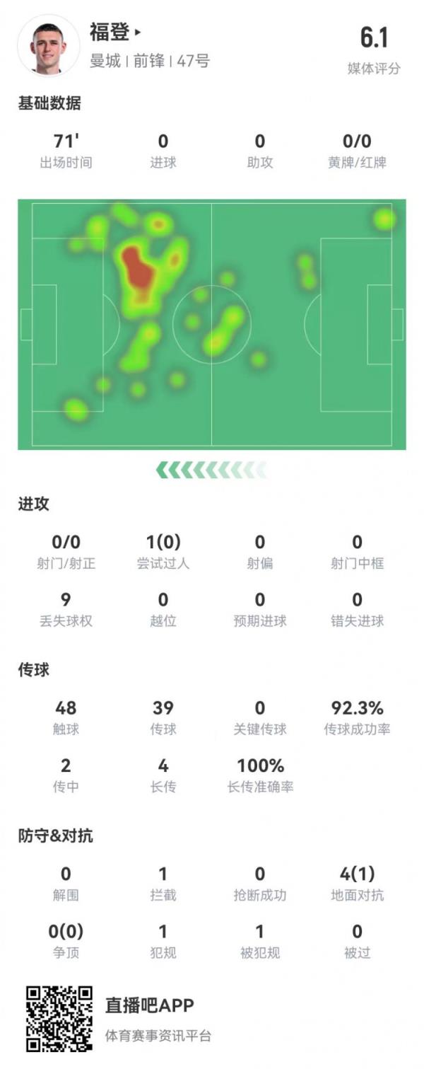 2月3日讯 阿森纳在本轮英超主场对阵曼城,福登本场数据如下: