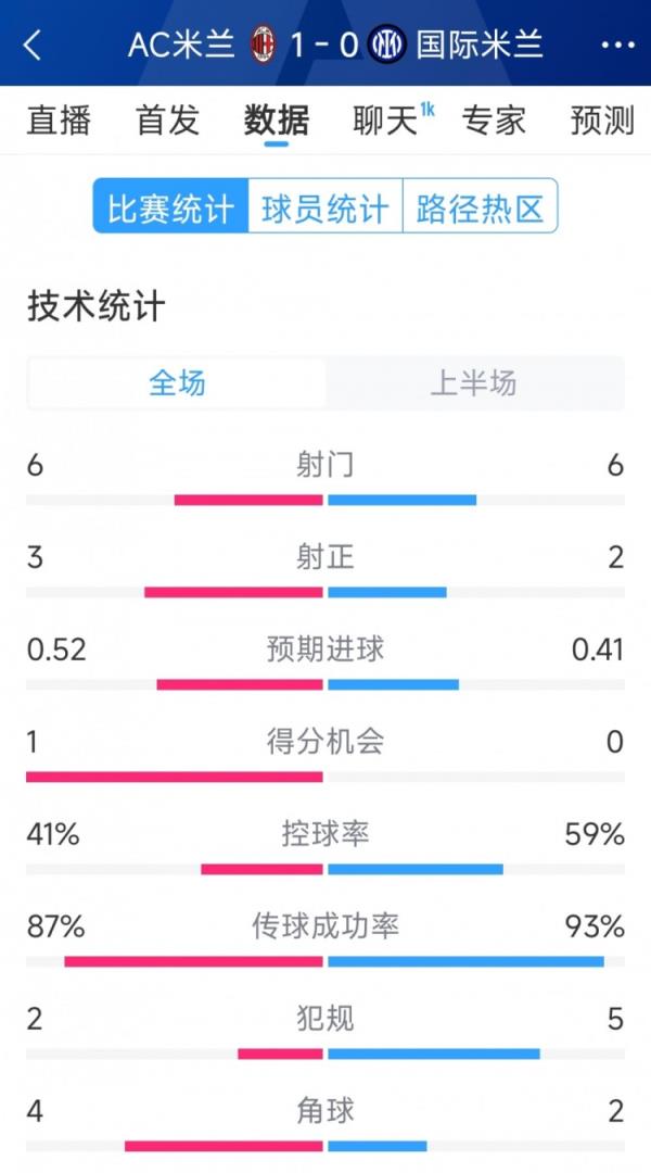 2月3日讯 在本轮意甲米兰德比半场战罢,AC米兰暂时1-0领先,以下为双方半场数据对比: