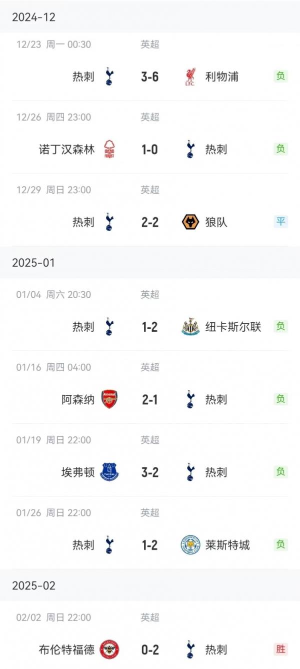 数据统计显示,热刺上次在英超赢球还是12月中旬5-0副班长南安普顿,自那之后他们遭遇1平6负。