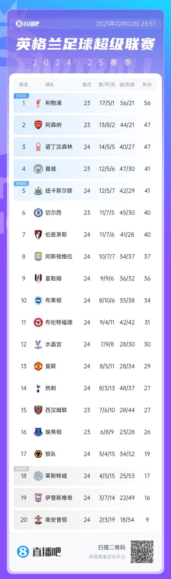 据统计,在近62场比赛中,曼联只赢下了26场。而在此期间,利物浦和阿森纳赢了41场比赛,曼城赢了40场比赛,维拉赢了30场比赛,纽卡赢了30场比赛,切尔西赢了29场比赛,热刺赢了28场比赛。