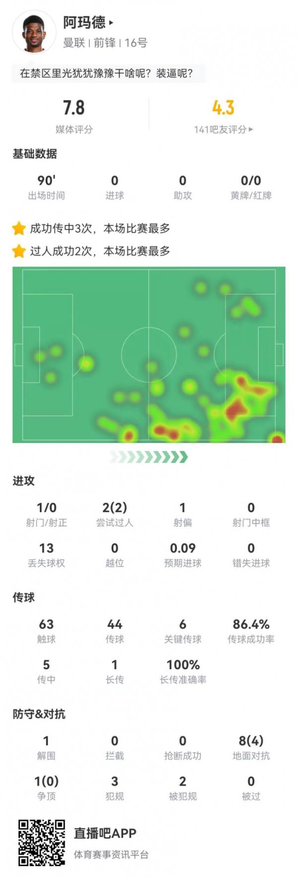 2月3日讯 曼联在本轮英超0-2不敌水晶宫,阿玛德本场数据如下: