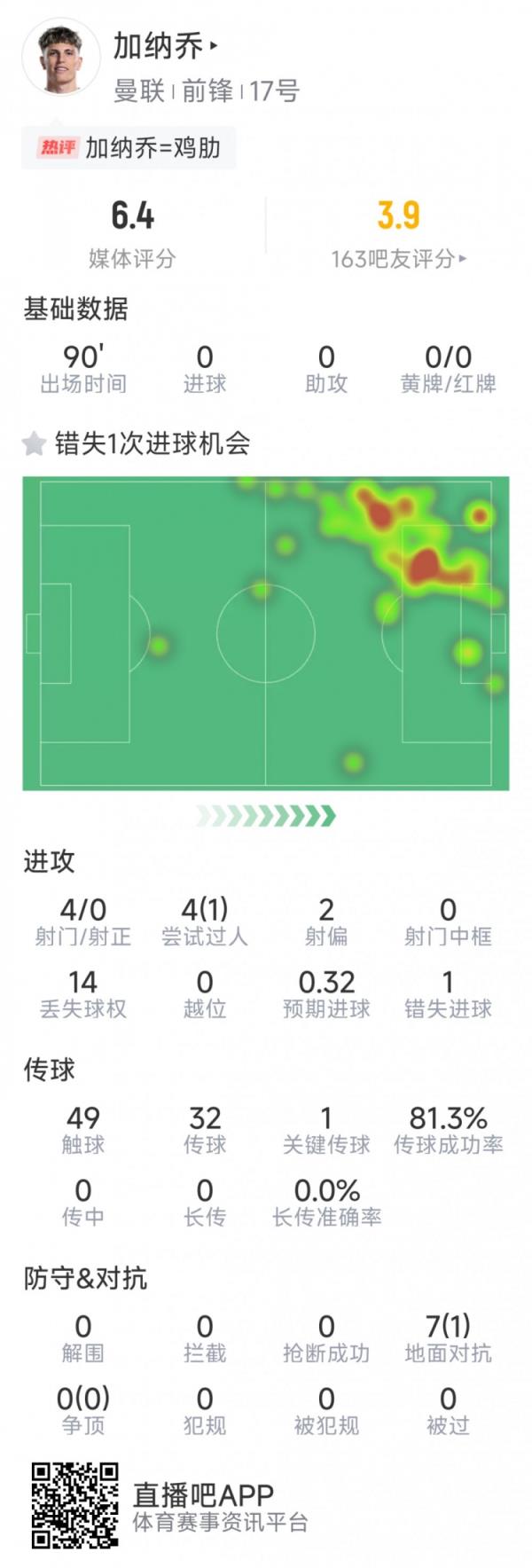 2月3日讯 在本轮英超,曼联0-2不敌水晶宫。本场比赛加纳乔发挥不佳,以下为他在本场数据: