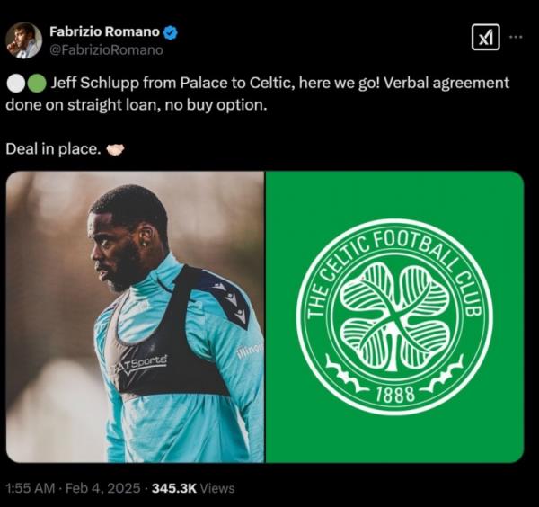2月4日讯 名记罗马诺用标志性的here we go确认,水晶宫中场施鲁普将以租借形式加盟凯尔特人。