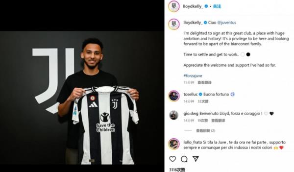 凯利通过社媒晒出自己手持尤文球衣的加盟照,并配文:“你好(ciao,意大利语),@尤文图斯俱乐部。”