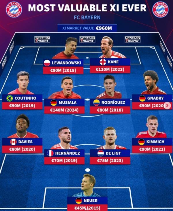 德转列拜仁球员历史身价最贵阵:总身价9.60亿欧元