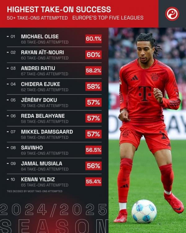 2月8日讯 squawka统计了本赛季五大联赛过人成功率情况,奥利塞居首,而五大联赛成功过人次数最多的亚马尔并未进入前十。