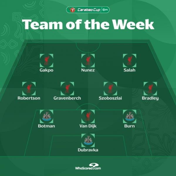 2月8日讯 联赛杯半决赛次回合已经完赛,纽卡2-0双杀阿森纳、利物浦4-0逆转淘汰热刺。联赛杯官方也评出了本周最佳阵容。