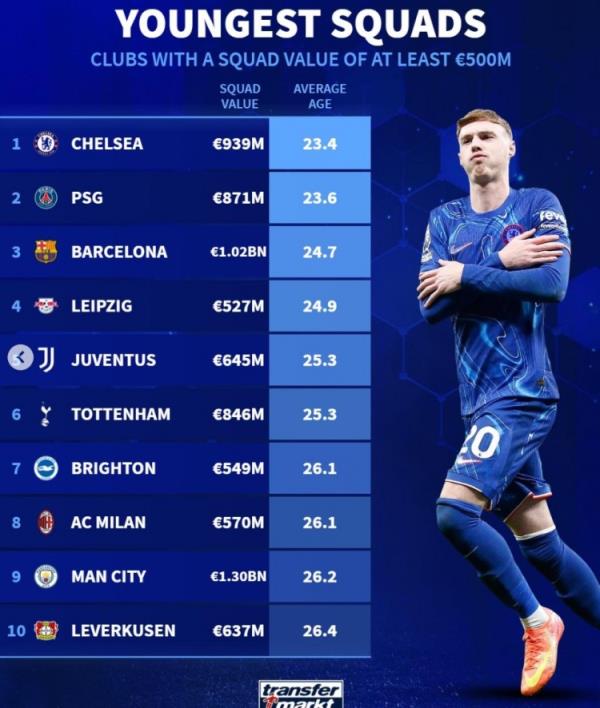 2月9日讯 《转会市场》统计了身价超过5亿欧元的球队当前阵容平均年龄最年轻榜单,切尔西居首。