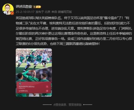 02月10日讯 足总杯第4轮,利物浦客场爆冷0-1不敌英冠倒数第一普利茅斯,止步32强,赛后评述员詹俊在社媒做出点评。