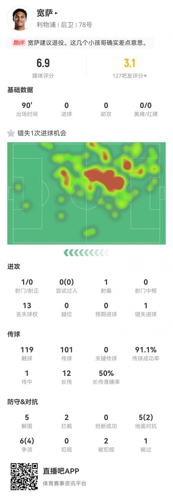 2月10日讯 利物浦在本轮足总杯0-1爆冷不敌普利茅斯,宽萨本场数据如下: