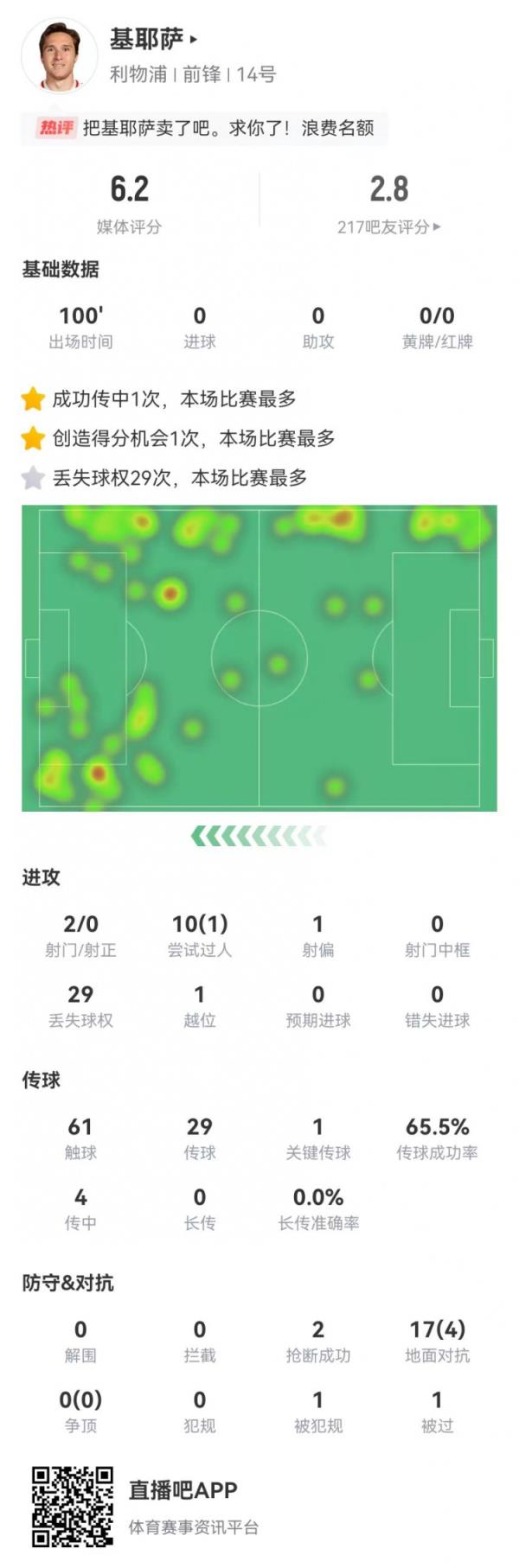 2月10日讯 利物浦在本轮足总杯爆冷0-1不敌普利茅斯,基耶萨本场数据如下:
