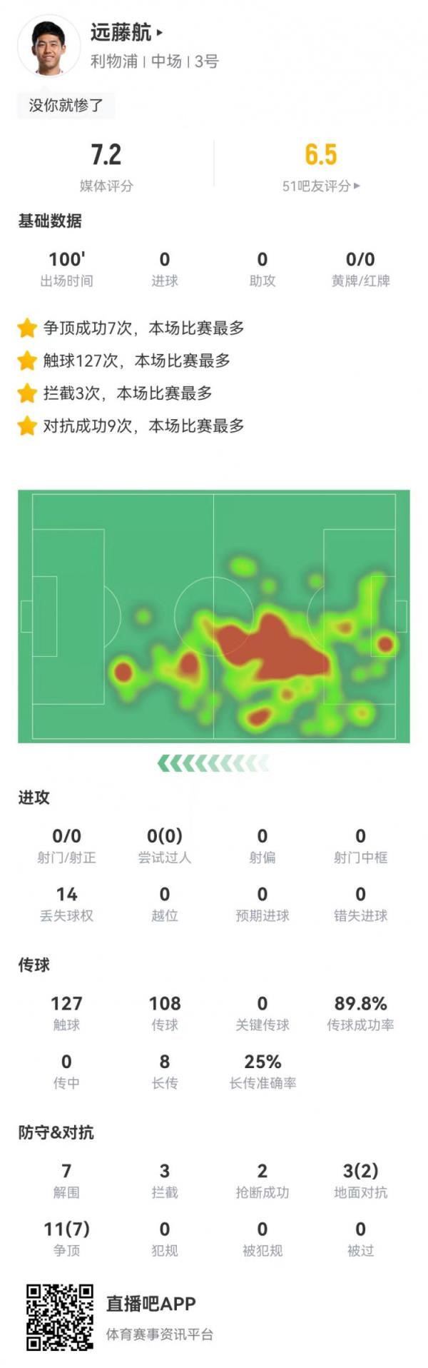 2月10日讯 利物浦在本轮足总杯0-1爆冷不敌普利茅斯,远藤航本场数据如下: