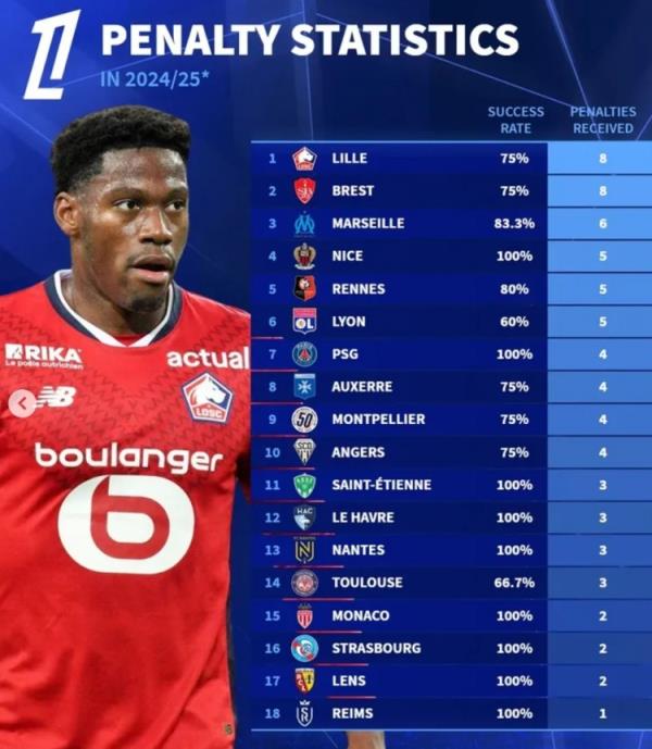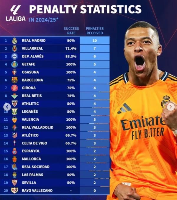 2月11日讯 《转会市场》统计了本赛季五大联赛获得点球次数情况,皇马10次最多,狼队和巴列卡诺至今为0。