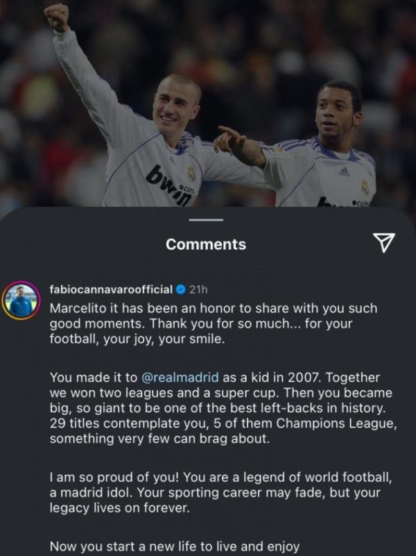 卡纳瓦罗表示:“小马塞洛,能荣幸能够和你共享一段美好时光。非常感谢你的足球技术以及你的快乐感染力。你在2007年加盟皇马时还是一个孩子,我们共同赢得了2座西甲和一座西超杯。而自那之后,你成长为了足坛历史最佳左后卫之一。”