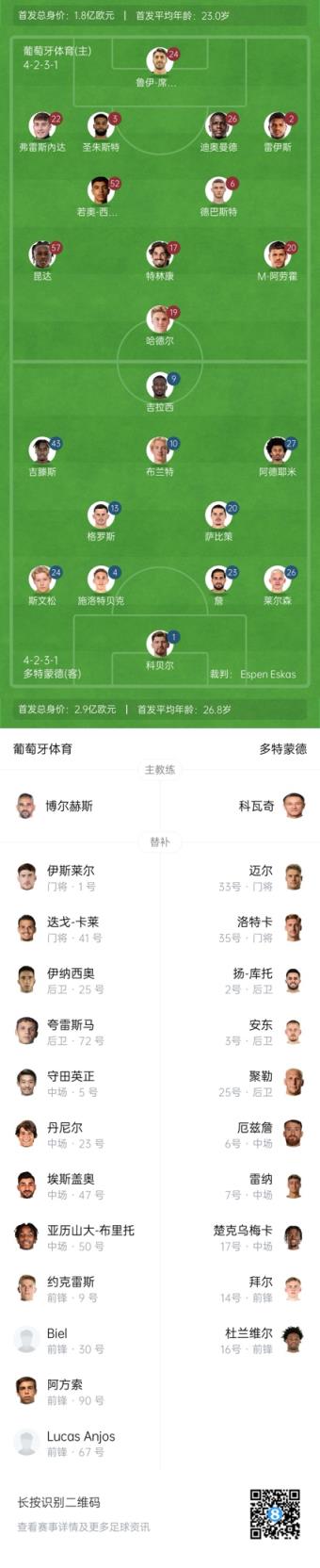 葡体首发:24-鲁伊-席尔瓦、2-雷斯、3-圣朱斯特、6-德巴斯特、17-特林康、19-哈德、20-马克西米利亚诺-阿劳霍、22-弗雷斯内达、26-迪奥曼德、52-西莫斯、57-昆达
