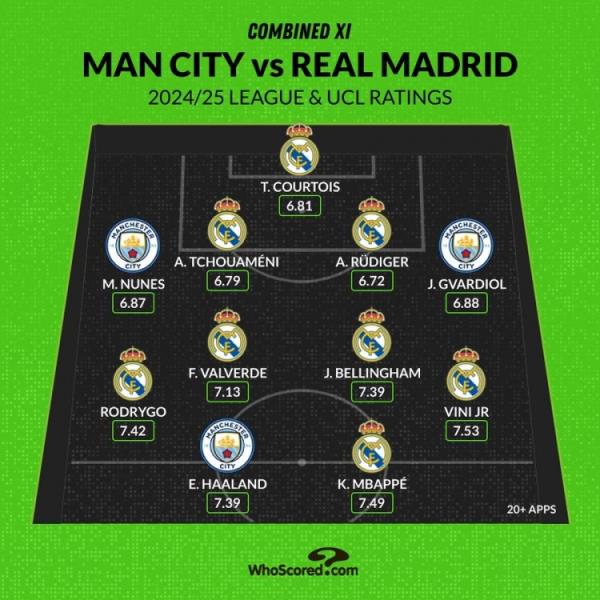 2月12日讯 皇马和曼城将在今晚欧冠附加赛首回合强强对决,whoscored则列出了两队本赛季评分合体最佳阵容。