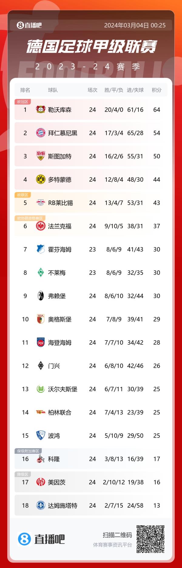 03月04日讯 德甲第24轮,勒沃库森2-0击败科隆。勒沃库森的各赛事不败场次已经来到了34场,继续扩大德国球队各赛事不败场次纪录,此前的纪录是弗里克的拜仁创造的32场。