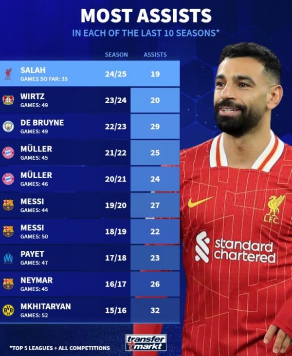 2月14日讯 萨拉赫在本赛季以19次助攻领跑五大联赛各项赛事总助攻榜,《转会市场》也列出了近10赛季的总助攻王情况。