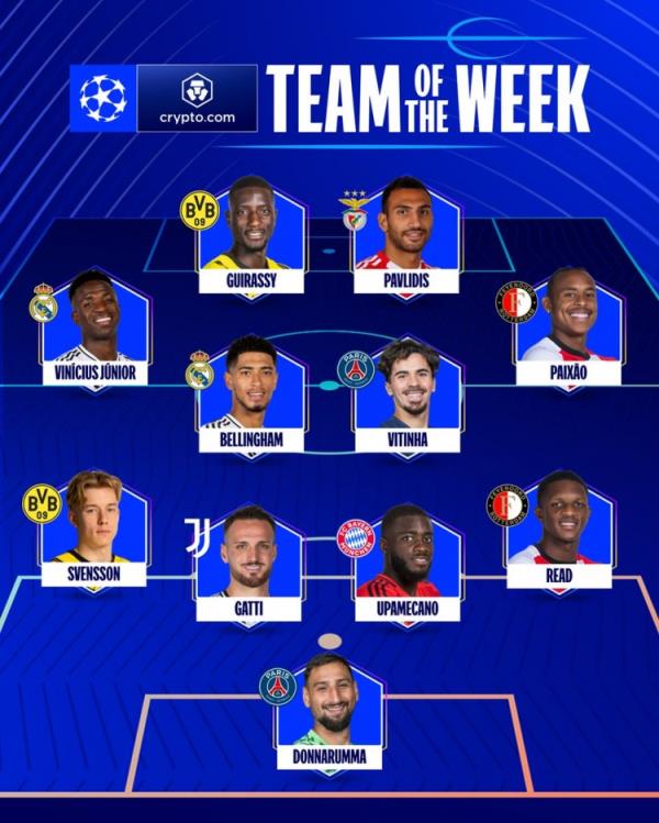 2月14日讯 欧冠官方公布本周最佳阵,维尼修斯、贝林厄姆、于帕梅卡诺、多纳鲁马等球员入选。