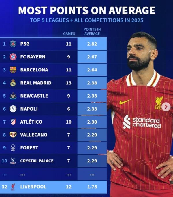 2月13日讯 《转会市场》统计了进入新年后五大联赛球队各项赛事场均拿分情况,巴黎独自领跑。