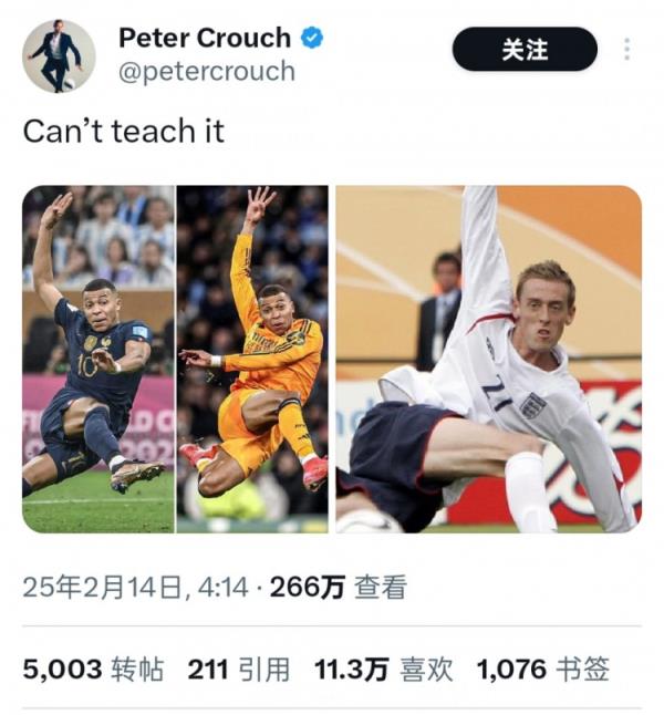 英格兰前国脚克劳奇在社交媒体上晒出了姆巴佩和自己凌空射门的动作对比图,并写道:“这可教不来!”身高超过两米的克劳奇在球员时代经常上演倒钩等高难度破门。