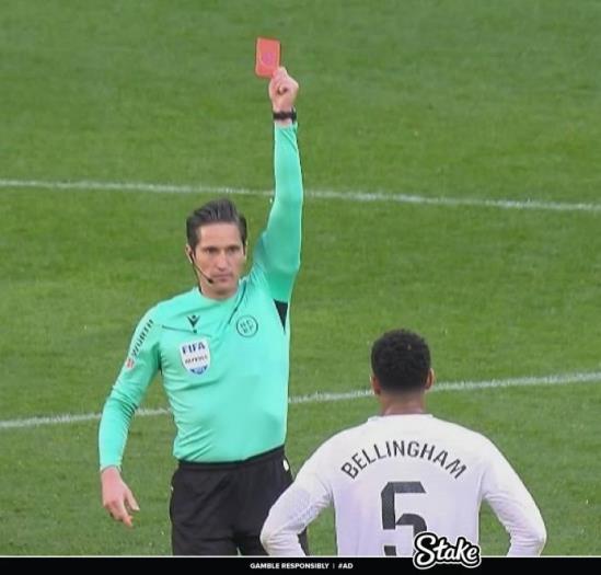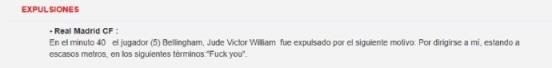 在赛后裁判报告中,谈及贝林厄姆被红牌罚下的原因:他在距离我仅数米远的地方,对我说了“Fxxk you”。