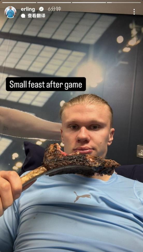 哈兰德晒出自己啃牛排的照片,并写道:比赛之后小小款待一下。
