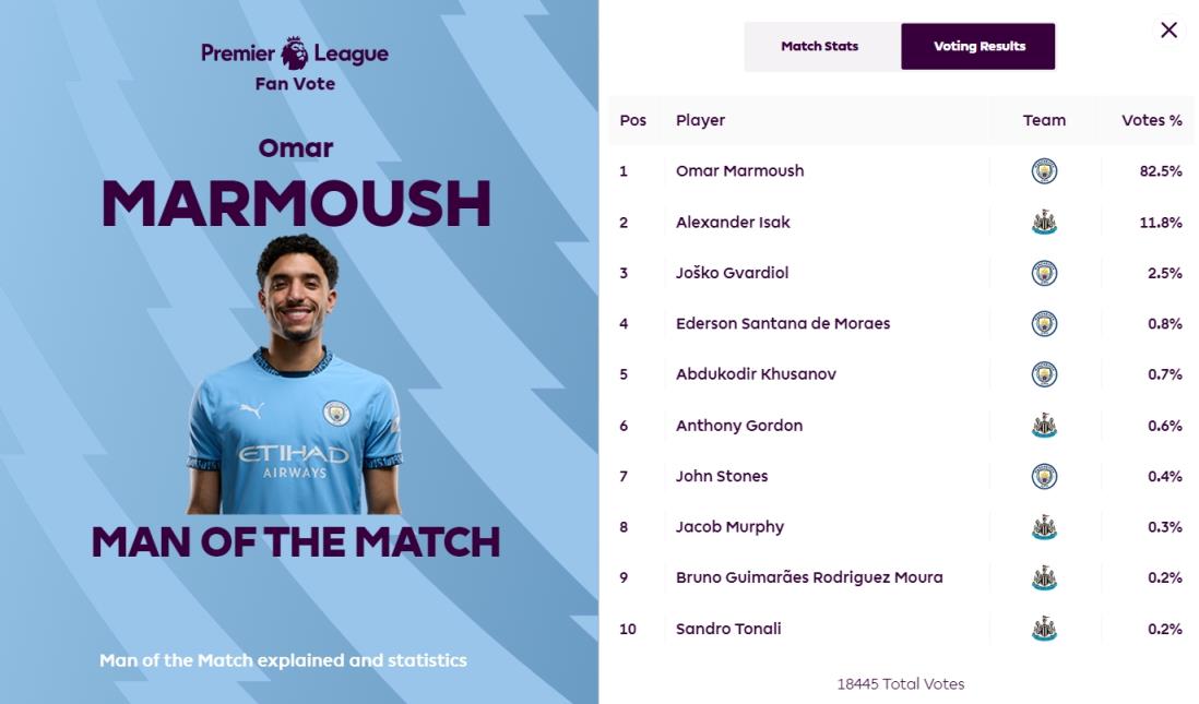 英超官方赛后宣布,马尔穆什被球迷票选为本场比赛全场最佳,得票率高达82.5%。