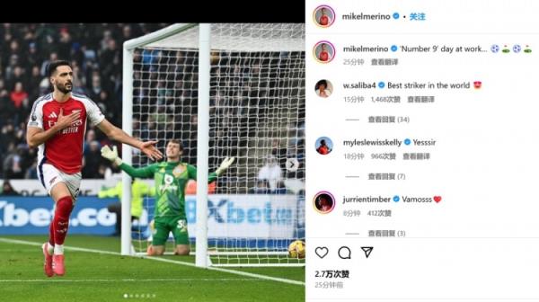 梅里诺首次客串中锋便打进2球,他也通过社媒晒出自己进球后的庆祝照,并配文:“9号位上班日… ⚽️⛳️⚽️⛳️”