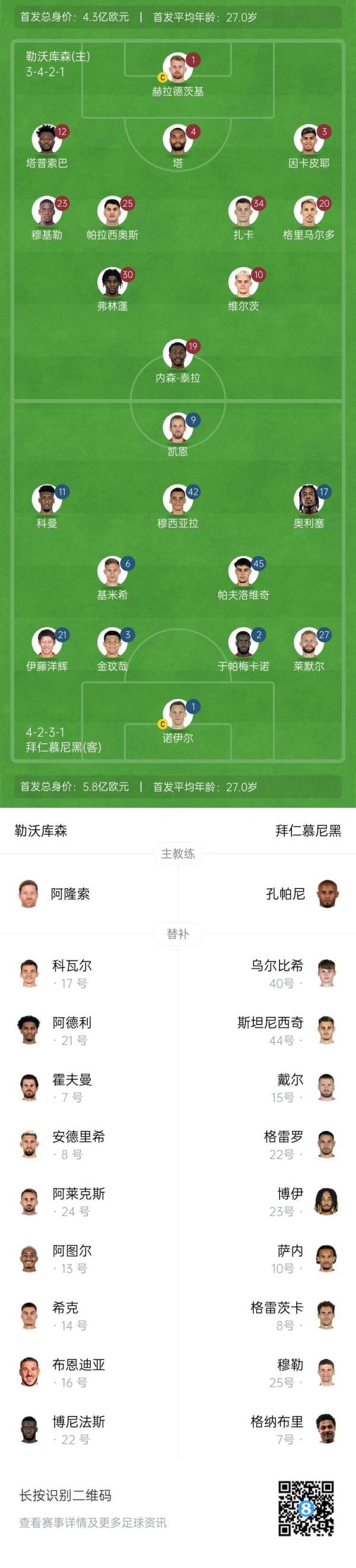 勒沃库森首发:1-赫拉德茨基、3-因卡皮耶、4-若纳坦-塔、12-塔普索巴、23-穆基勒、20-格里马尔多、34-扎卡、25-帕拉西奥斯、30-弗林蓬、10-维尔茨、19-内森-泰拉