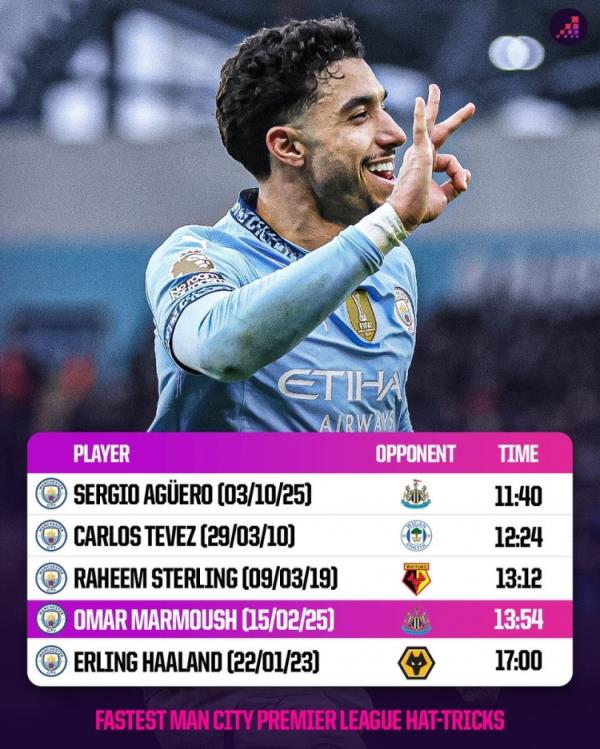 2月16日讯 曼城在本轮英超3-0领先纽卡,马尔穆什上半场戴帽,数据统计显示他3粒进球间隔仅13分54秒。