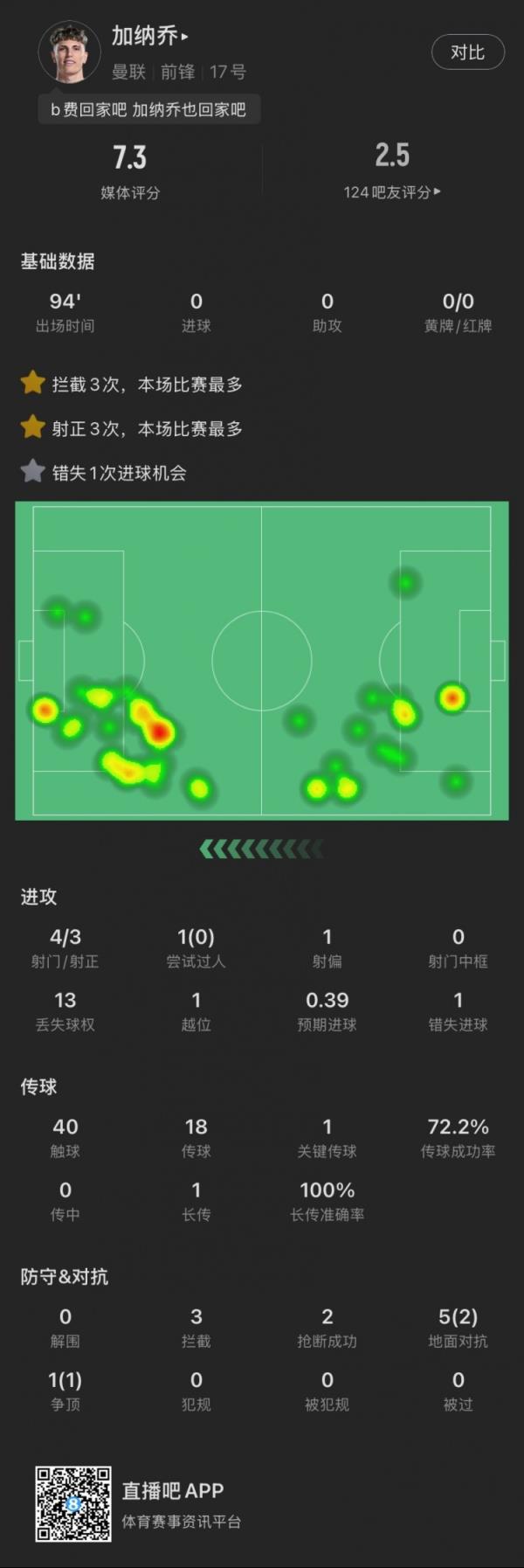 2月17日讯 在刚刚结束的英超本轮焦点战中,曼联0-1不敌热刺。本场比赛,加纳乔打满全场但表现欠佳,获评7.3分。