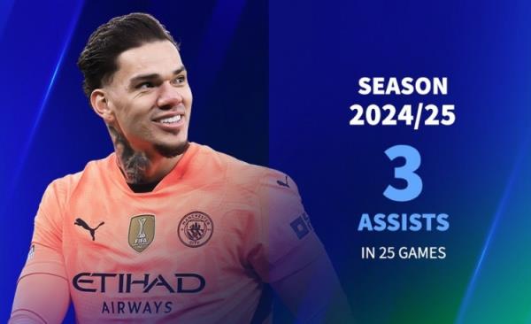 2月18日讯 曼城在本轮英超4-0完胜纽卡,埃德森助攻马尔穆什首开纪录,这也是前者本赛季25场比赛的第3次助攻。