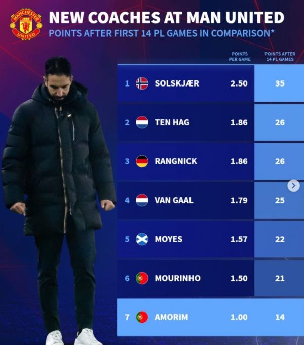 2月18日讯 曼联在换帅后成绩持续下滑,《转会市场》统计显示阿莫林是同期成绩最差的主教练。