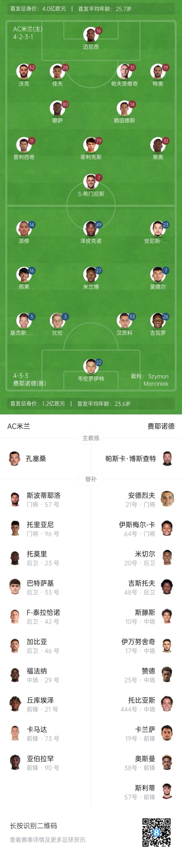 米兰首发:16-迈尼昂、32-沃克、28-佳夫、31-帕夫洛维奇、19-特奥、80-穆萨、14-赖因德斯、11-普利西奇、79-菲利克斯、10-莱奥、7-S-希门尼斯