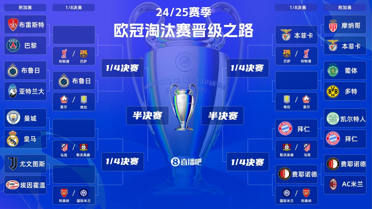欧冠淘汰赛抽签将在本周五晚上19:00正式开始。