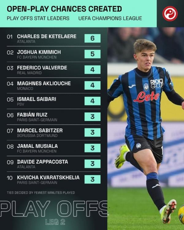 2月21日讯 根据Squawka统计,在欧冠淘汰赛附加赛次回合比赛中,亚特兰大中场德凯特拉雷是运动战创造机会最多的,一共达到了6次。