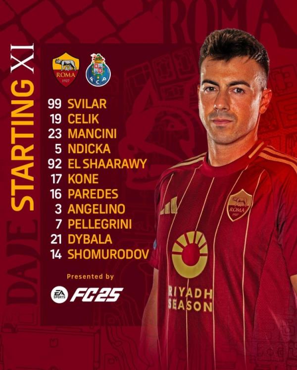 罗马首发:99-斯维拉尔、5-恩迪卡、23-詹卢卡-曼奇尼、19-切利克、3-安吉利诺、16-帕雷德斯、17-科内、92-沙拉维、7-佩莱格里尼、21-迪巴拉、14-肖穆罗多夫