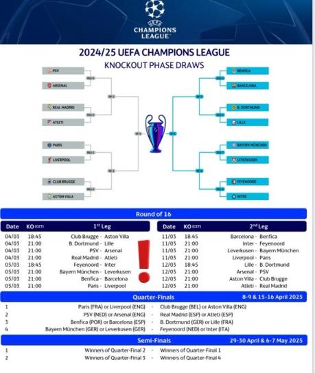 2月22日讯 24/25赛季欧冠淘汰赛赛程出炉,1/8决赛首回合将在3月5日凌晨开战。