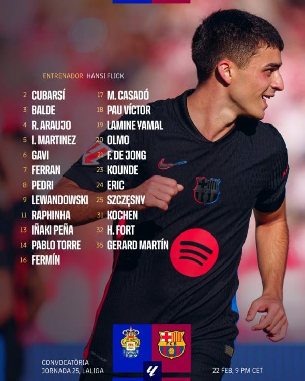 2月22日讯 北京时间明天凌晨4:00,巴萨将在西甲25轮中客战拉斯帕尔马斯。赛前,巴萨公布了将出战这场比赛的大名单。其中,莱万领衔,奥尔莫、亚马尔在列,费尔明解禁复出,法蒂缺席。