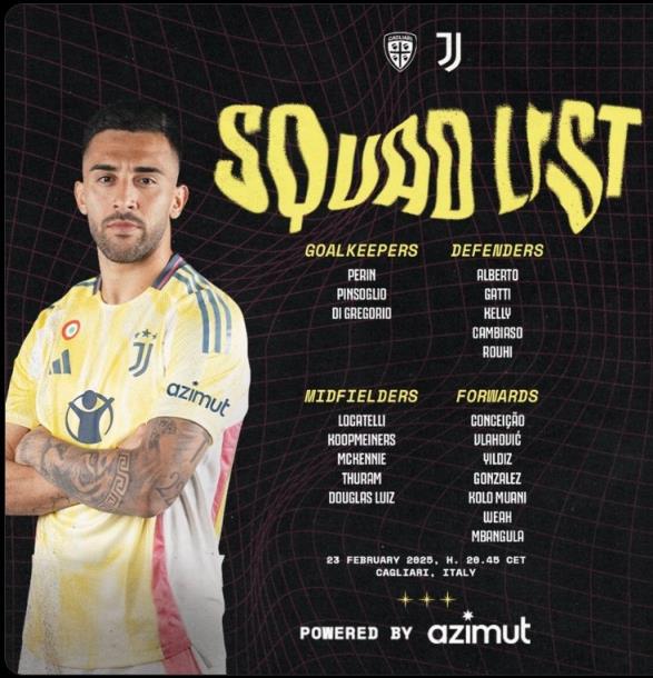 2月23日讯 本轮意甲尤文将对阵卡利亚里,球队官方也公布了本场大名单,具体如下: